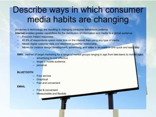 Consumer media habits are changing due to advances in technology. People now spend more time online than using traditional media like television. Being online allows for targeted digital advertising through methods like SMS, email, and Bluetooth. Brand development aims to make a product well-known in the marketplace and build awareness, familiarity, and positive imagery, while direct-response marketing specifically solicits a direct response. Major branding concepts include the brand promise, brand attributes, and brand personality. Marketers now use personalization, co-creation of content, purchase process streamlining, customization, and dynamic pricing to build and reinforce brands online.