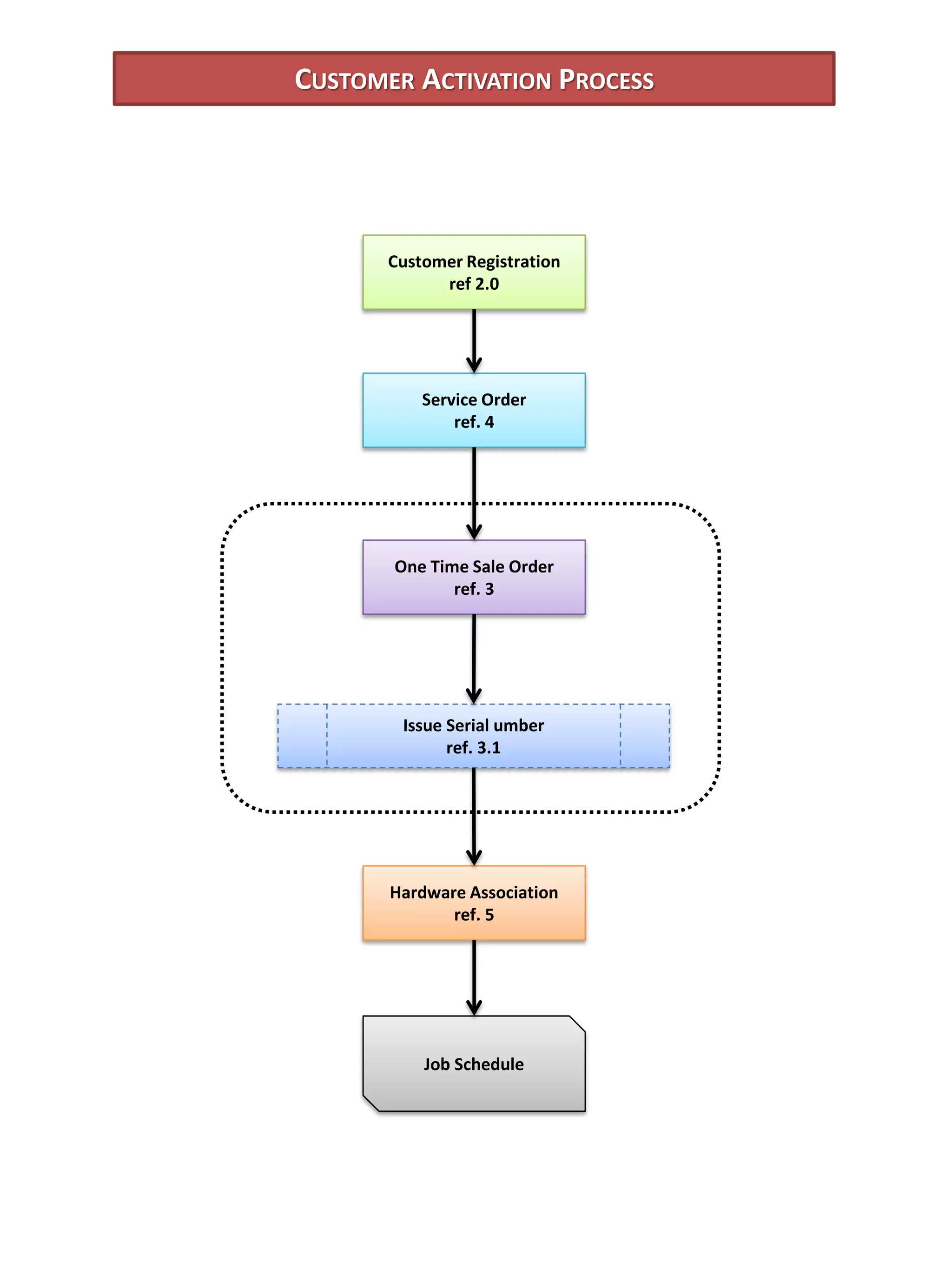 The document outlines a customer activation process that includes customer registration, a service order, a one time sale order, issuing a serial number, hardware association, and scheduling a job. The process registers customers, takes service orders, completes one time sales, issues identifying numbers, associates hardware, and schedules installation work.