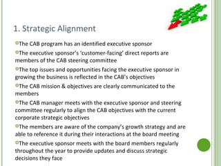 The document outlines best practices for establishing and managing a world-class Customer Advisory Board (CAB) across seven core competencies: strategic alignment, member engagement, program management, content creation, actionable insights, internal influence, and measurable success. It emphasizes the importance of engaging members, effective communication, and measurable outcomes to enhance the value derived from the CAB. Additionally, it provides a call to action for potential members to join the industry association for further involvement.