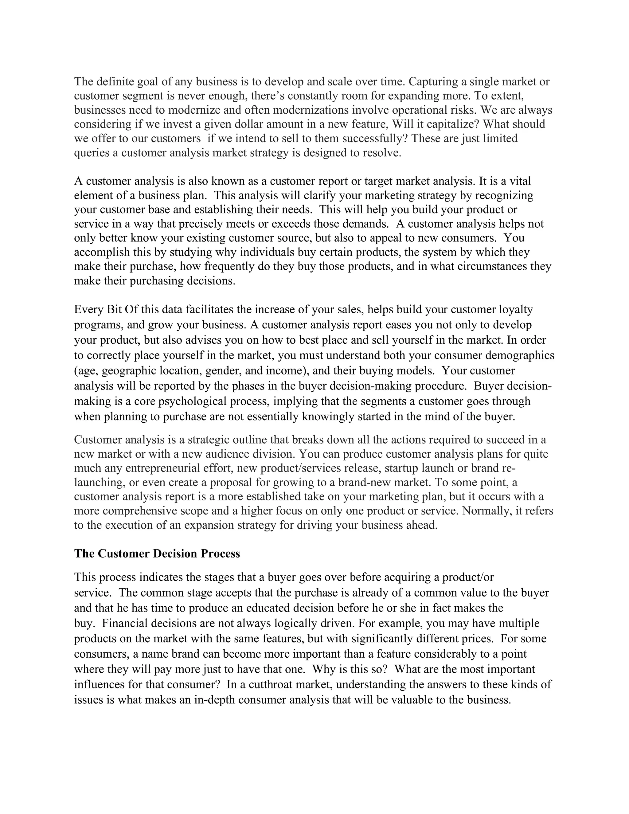 The document discusses conducting a customer analysis to better understand customers and their needs in order to develop effective marketing strategies. A customer analysis examines who the customers are, what their needs and buying behaviors are, and the stages of their decision making process. Understanding this information helps businesses create products that meet customer demands, attract new customers, build loyalty, and grow sales. The document outlines the typical stages a customer goes through when making a purchase decision and how businesses can position themselves at each stage.
