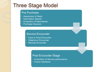 The document outlines a three stage model of consumer buying behavior in services: 1) pre-purchase including need recognition, information search, and alternative evaluation; 2) service encounter which can be face-to-face, telephonic, or remote; and 3) post-encounter evaluation of service performance and future intentions. It also discusses factors that influence each stage like information sources, types of risk, service qualities, and post-purchase evaluation leading to word-of-mouth or searching for alternatives.