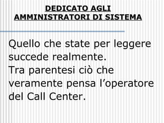 Il documento è un dialogo umoristico tra un operatore di call center e un utente, evidenziando la frustrazione dell'utente nei confronti della scarsa competenza dell'operatore. Durante la conversazione, l'operatore mostra difficoltà nel comprendere il concetto di username e password, creando situazioni comiche. La narrativa mette in luce le tensioni che si possono creare tra utenti e tecnici nel supporto tecnico.