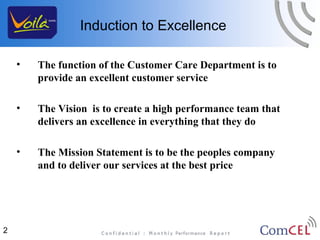 The document provides information on the staffing and operations of a customer care department. It includes organizational charts showing employee schedules and team structures. It also outlines departmental focuses and key initiatives for Q3, such as hiring more customer care agents, implementing new sales support functions, and improving network quality. The goal is to provide excellent customer service while meeting sales targets and growing the customer base through affordable voice services.