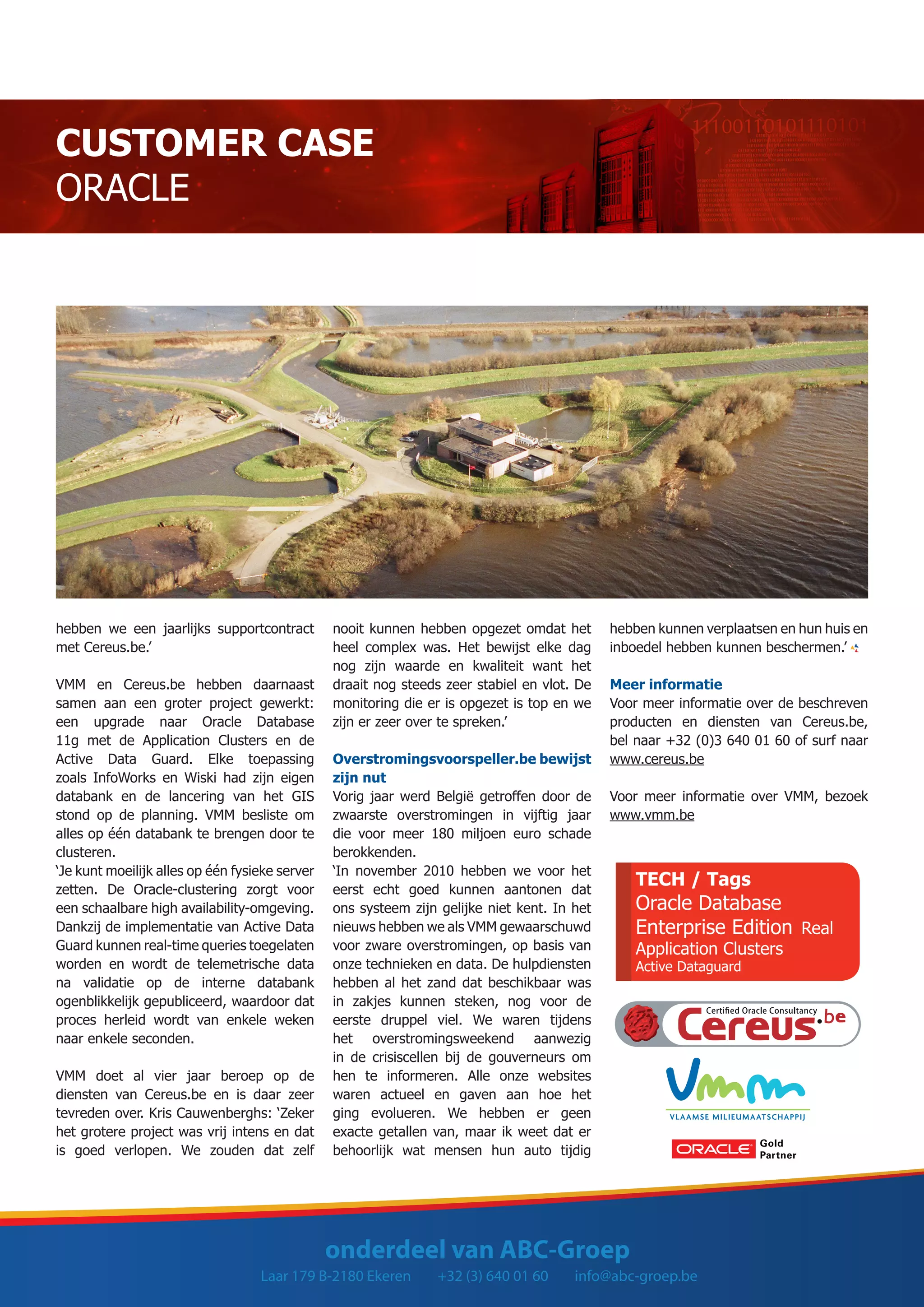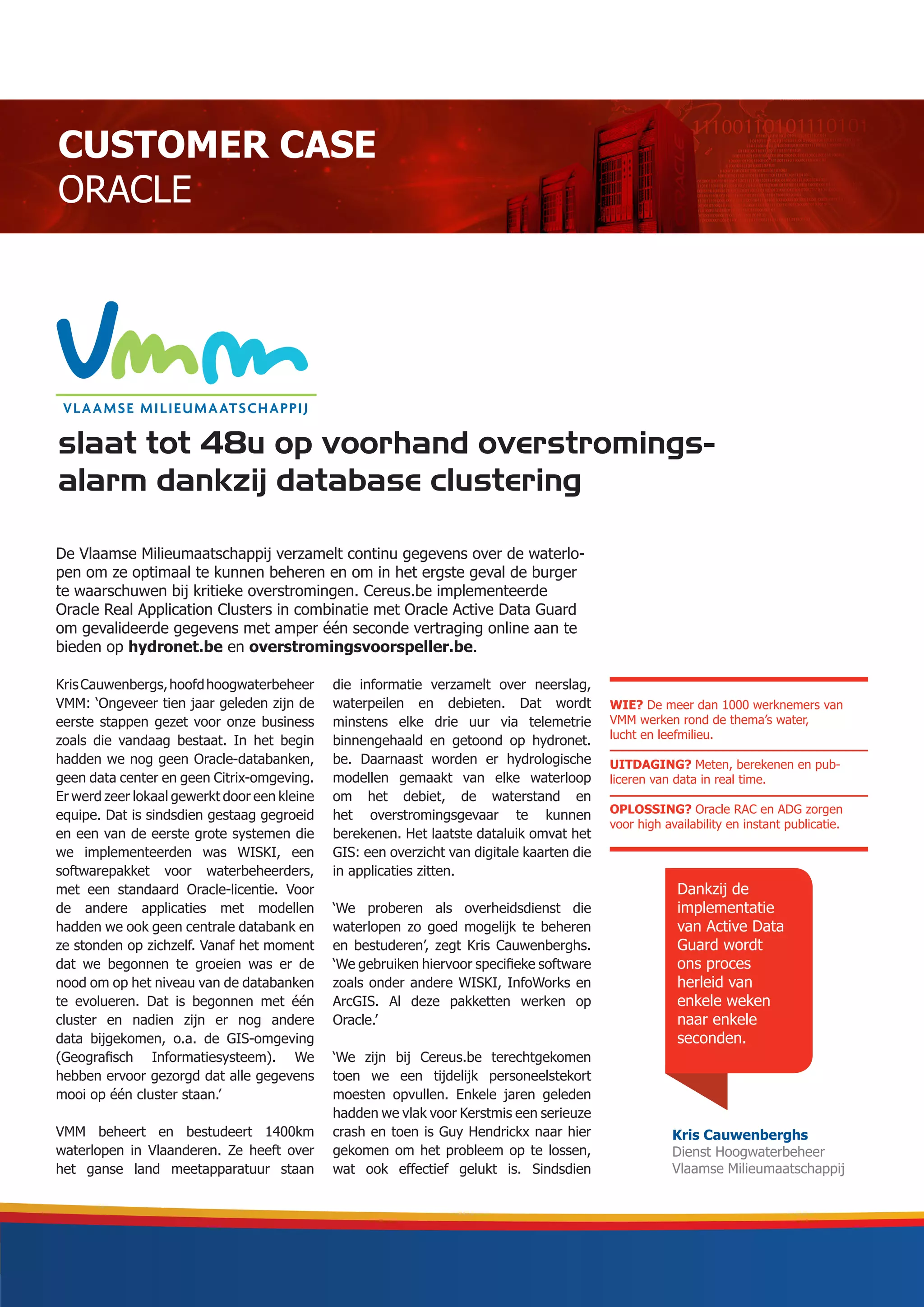 De Vlaamse Milieumaatschappij verzamelt continu gegevens over de waterlopen om ze optimaal te kunnen beheren en om in het ergste geval de burger te waarschuwen bij kritieke overstromingen. Cereus.be implementeerde Oracle Real Application clusters in combinatie met Oracle Active Data Guard om gevalideerde gegevens met amper één seconde vertraging online aan te bieden op hydronet.be en overstromingsvoorspeller.be.