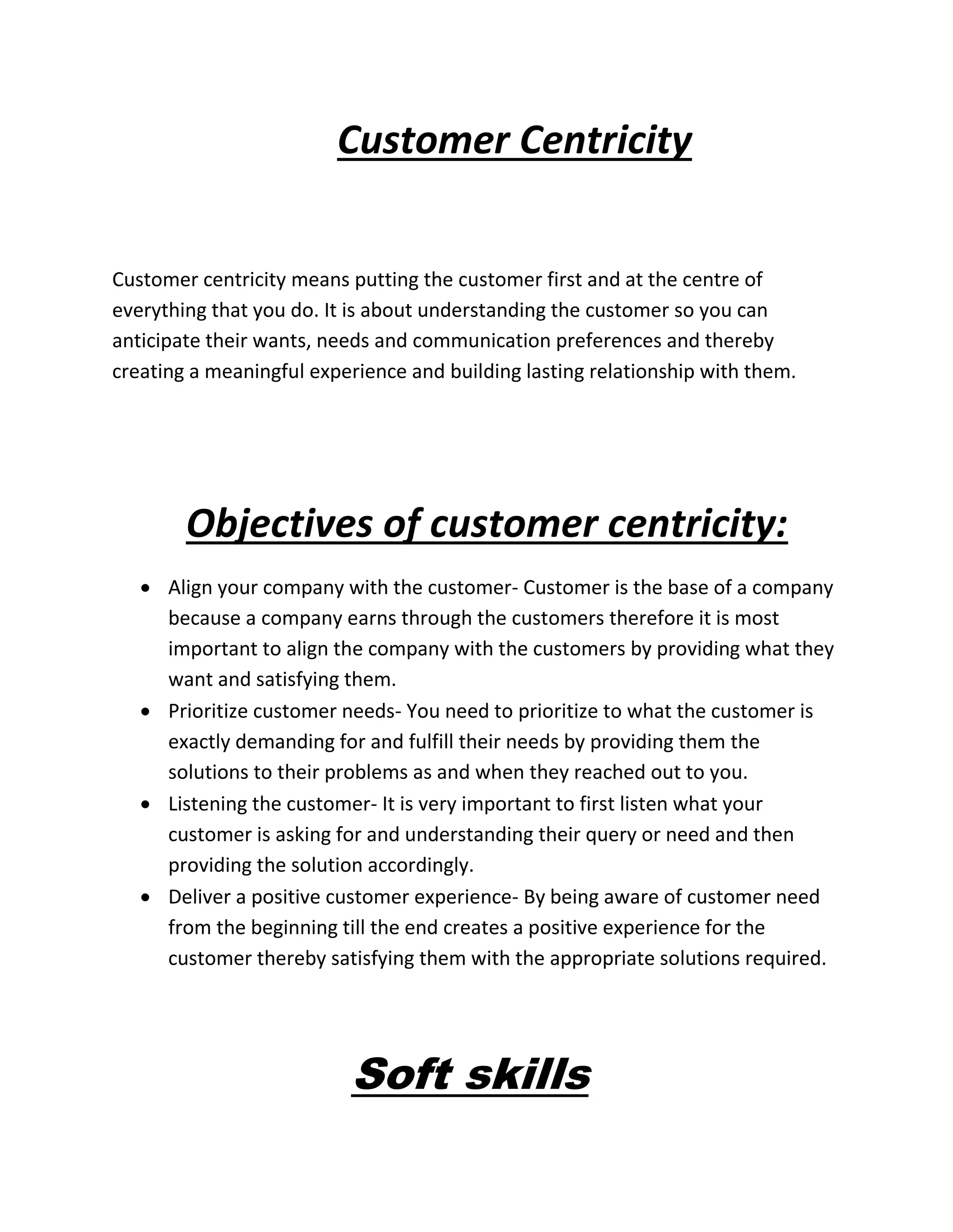 Customer centricity means putting the customer first and understanding their wants, needs, and preferences to create meaningful experiences and build lasting relationships. The objectives of customer centricity are to align the company with customer needs, prioritize fulfilling those needs, listen to customers, and deliver positive customer experiences. Soft skills refer to interpersonal skills like communication, leadership, teamwork, and time management that help people interact with others and succeed in their work. Examples include communicating with clients, mentoring coworkers, leading teams, following instructions, and completing tasks on time.