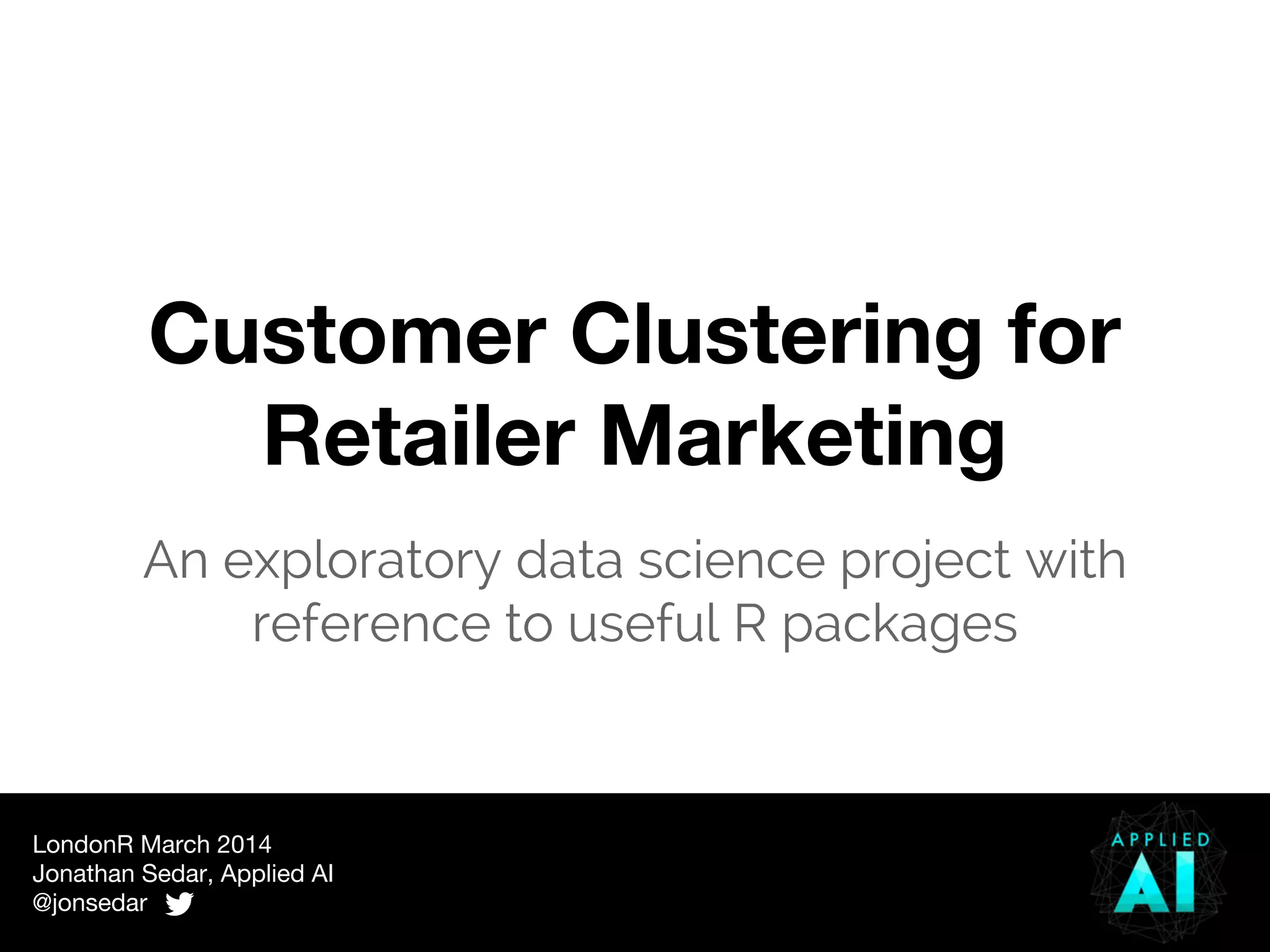 The document outlines an exploratory data science project focused on customer clustering for retailer marketing, utilizing R packages to analyze a dataset of 32,000 customers and 800,000 transactions. It details the process of sourcing, cleaning, and visualizing data, and emphasizes methods for feature creation, selection, and clustering to enhance understanding of customer behavior for targeted marketing strategies. The project aims to uncover insights about shopping behaviors to inform business decisions such as targeted promotions and optimizations in stock levels and store layout.