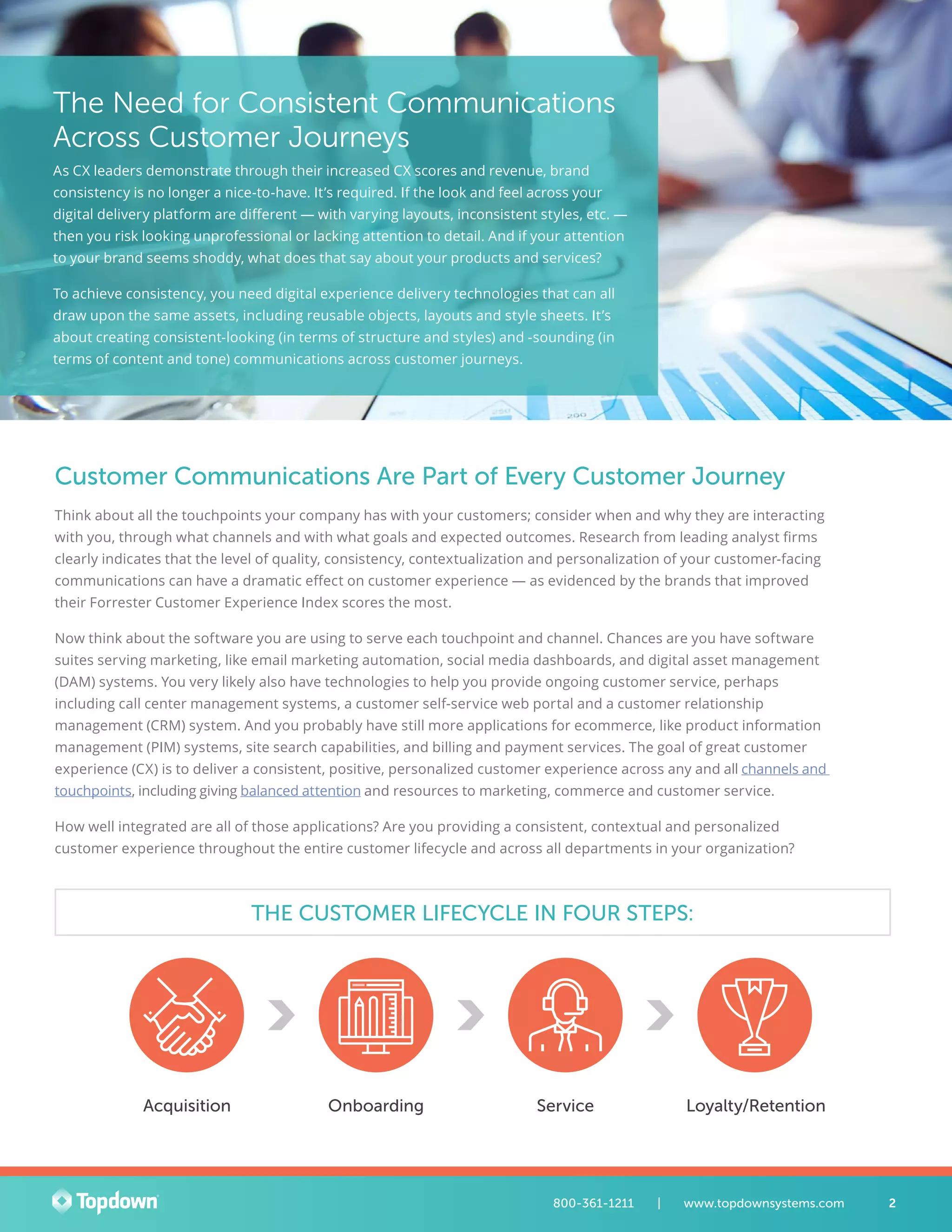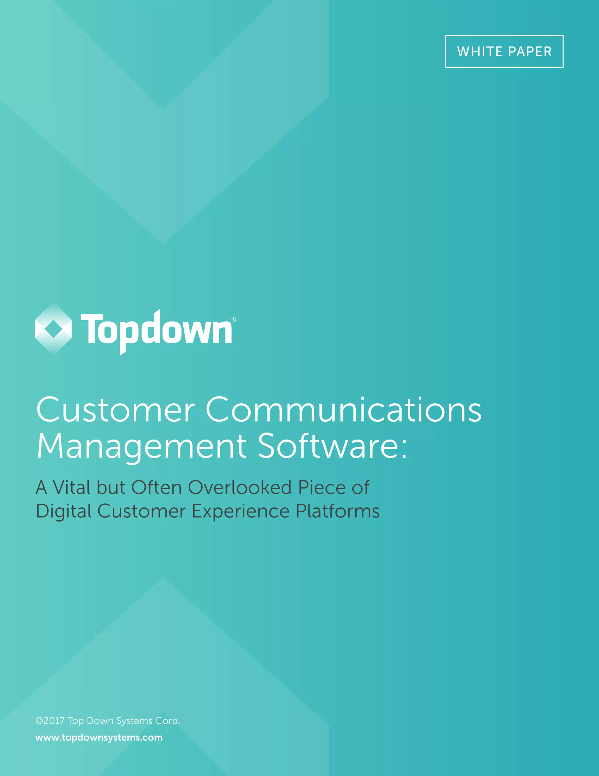 The white paper discusses the importance of customer communications management (CCM) software as a critical component of digital customer experience platforms, emphasizing the need for consistent and personalized communications across customer journeys. It highlights the current lack of integration of CCM within many digital experience (DX) platforms and advocates for moving CCM to the cloud for improved efficiency and responsiveness. The document also stresses the necessity for organizations to adopt a digital-first mindset in their customer communication strategies to meet evolving customer expectations.