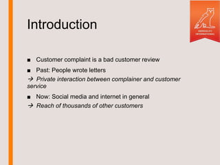 This document discusses customer complaints and how businesses should handle them. It notes that while customers used to write letters with complaints, social media now allows complaints to reach thousands. Negative reviews can cost businesses customers, and most unhappy customers never complain. Complaints provide opportunities to understand customer perceptions and ensure continual improvement. The golden rules of handling complaints are to take them seriously, never snub a complainer, see things from the customer's perspective, and train staff on proper complaints handling. Complainers primarily want an apology, explanation, and reassurance. The recommended approach is to thank customers for complaining, apologize, get the full details, correct any mistakes, and learn from the experience.