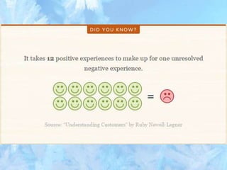 The document discusses customer delight and how exceeding customer expectations can lead to positive word-of-mouth promotion. It emphasizes that customer delight involves creating an individualized experience for each customer to enhance their relationship with the brand. To achieve customer delight, companies should give customers what they need, deliver services on time, and provide value. This ensures expectations are exceeded, which leads to customer satisfaction and can create a "wow factor" that builds loyalty.