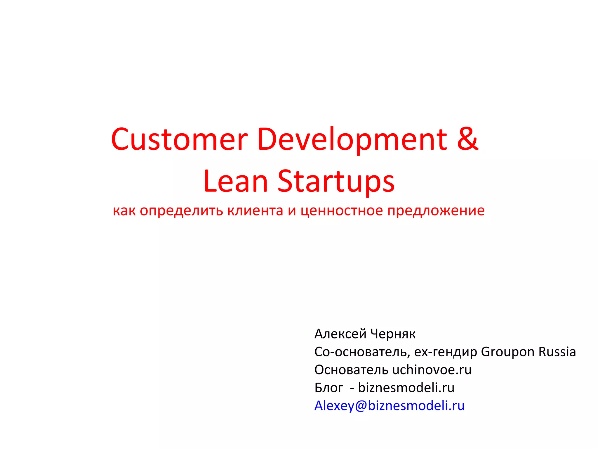 Документ описывает подходы к customer development и lean startup, акцентируя внимание на том, как определять клиента и его ценностное предложение. Алексей Черняк делится опытом и методами внедрения стартапов, подчеркивая важность понимания потребностей клиентов и активного взаимодействия с ними. Основное внимание уделяется необходимости решения реальных проблем клиентов и проведению интервью для выявления их потребностей.