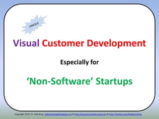 The document outlines a framework for developing 'blue ocean startups,' which focus on creating innovative markets and minimizing competition. It emphasizes the importance of customer development methodologies by Steve Blank and outlines a four-stage customer development roadmap: customer discovery, validation, creation, and company building. Key elements include the need for a strong value proposition, a scalable business model, and tools for systematically identifying and addressing customer needs.