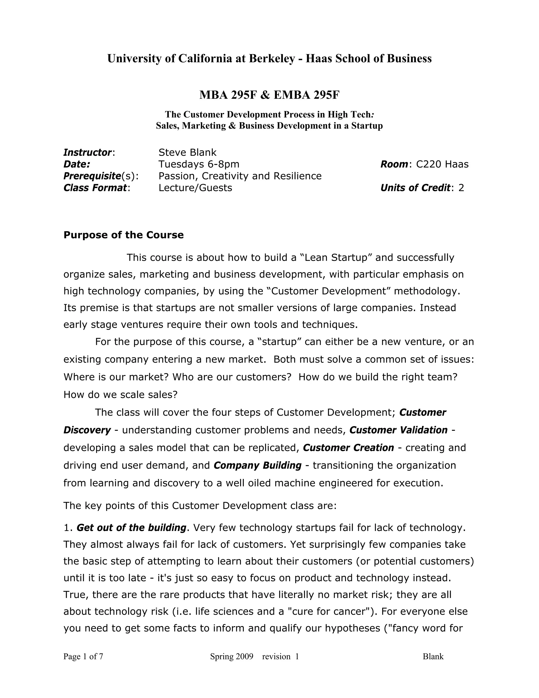 This document provides information about a course titled "The Customer Development Process in High Tech: Sales, Marketing & Business Development in a Startup" taught by Steve Blank at UC Berkeley Haas School of Business. The course uses the Customer Development methodology to teach students how to build successful startups, with a focus on sales, marketing, and business development in high-tech companies. It covers the four steps of Customer Development: Customer Discovery, Customer Validation, Customer Creation, and Company Building. Students will be evaluated based on application exercises, a research paper, and class participation. The course combines lectures, readings, case studies, and guest speakers.
