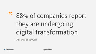 The document discusses the challenges and strategies related to customer-driven digital transformation, noting that a significant percentage of companies fail in their transformation initiatives due to lack of strategy and cultural inertia. It outlines a six-step process for successful transformation, including defining mission, mapping user experience, identifying problems, creating a roadmap, transforming incrementally, and adopting an experimental mindset. Ultimately, it emphasizes the importance of understanding customer needs and engaging them in the transformation process.