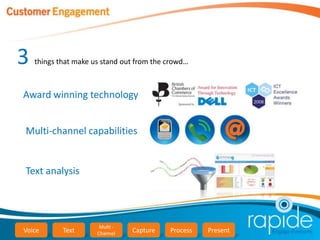 Rapide provides customer feedback solutions that capture feedback through multiple channels such as voice, text, and online. Their technology analyzes large amounts of customer data to identify key insights such as opportunities, threats, and customer sentiment. This allows companies to quickly address issues and improve customer satisfaction.