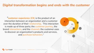 The document discusses customer experience management (CX) as the product of interactions between organizations and customers, emphasizing the importance of understanding customer journeys, behaviors, and preferences. It outlines key questions for analyzing customer interactions and suggests various use cases for improving customer retention and satisfaction through data analytics and real-time decision-making. The content promotes TigerGraph's capabilities in managing customer relationship data and enhancing marketing analytics.