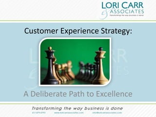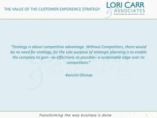 This document outlines key elements of a successful customer experience strategy. It discusses appointing a senior customer experience leader to develop the strategy and ensure accountability. The strategy should define the company's mission, vision, and annual plans. It also recommends mapping the customer journey, simplifying processes, assessing maturity levels, and sharing accountability across departments. Regularly capturing customer feedback through programs like Voice of the Customer is also presented as important. The overall message is that an effective customer experience strategy can increase revenues and loyalty.