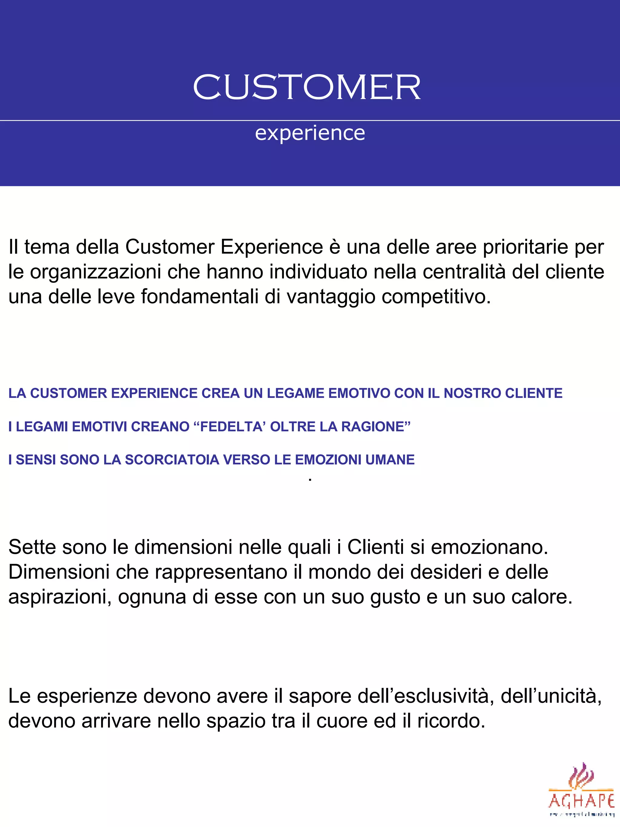 La customer experience è essenziale per le organizzazioni che puntano alla centralità del cliente come vantaggio competitivo. Essa si fonda su legami emotivi e esperienze uniche che coinvolgono tutti i sensi, trasformando interazioni formali in relazioni amichevoli. Importante è anche utilizzare queste esperienze per creare comunicazione attiva e condividere momenti speciali che vanno oltre il semplice consumo.