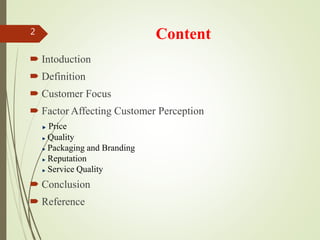 The document discusses factors that affect customer perception, including price, quality, packaging and branding, reputation, and service quality. It defines customer perception as a customer's opinion or view about a brand or company based on their experiences. Several key factors are shown to influence customer perception, such as price (customers favor economically priced items but may see very cheap items as low quality), quality (how well a product satisfies customer needs), and service quality (how well delivered service meets customer expectations). The document concludes that understanding factors affecting customer perception can help companies improve customer satisfaction.