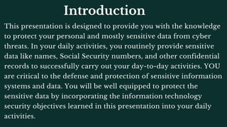 This document is a presentation on protecting personal and sensitive information from cyber threats, outlining the importance of information security and individual responsibility. It covers various aspects of cybersecurity including common threats, incidents, protective measures such as strong password practices, and awareness against social engineering attacks. The document emphasizes proactive steps individuals and organizations can take to secure their information assets and mitigate risks.