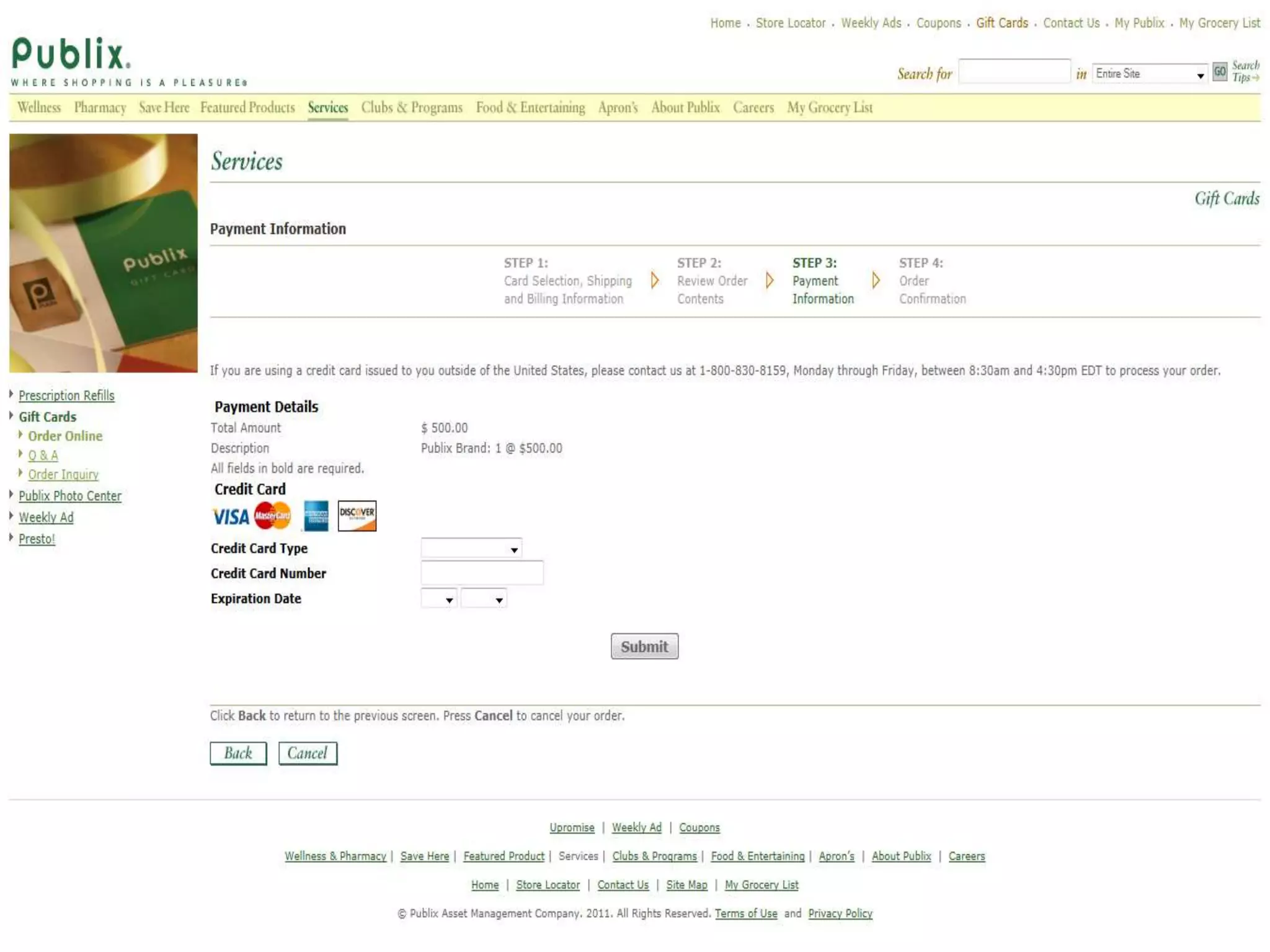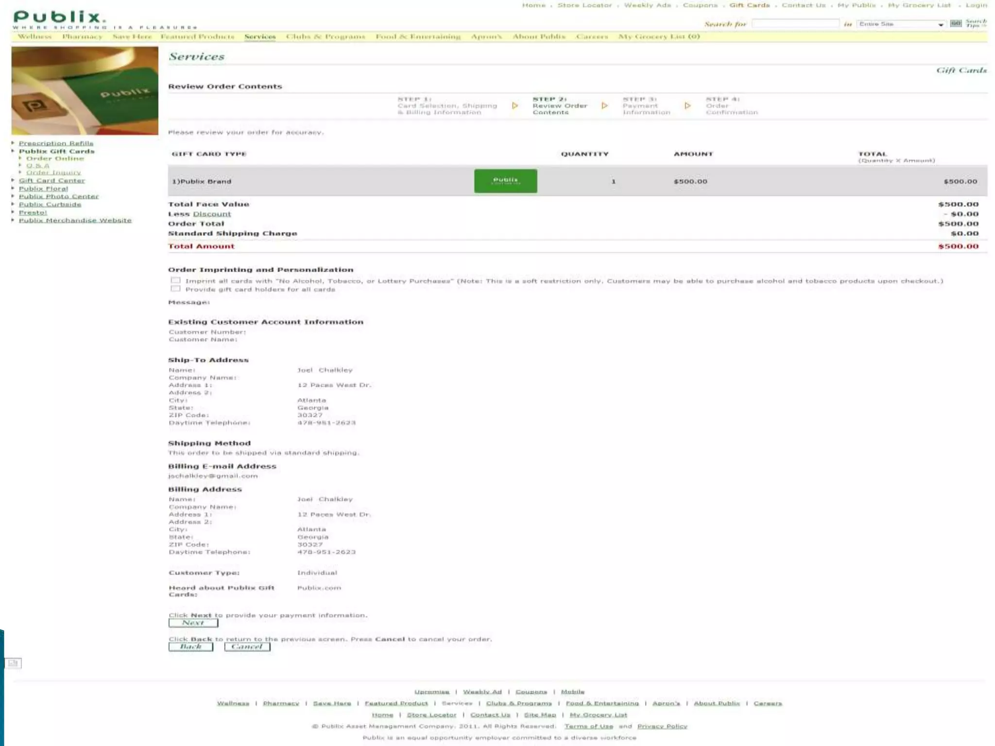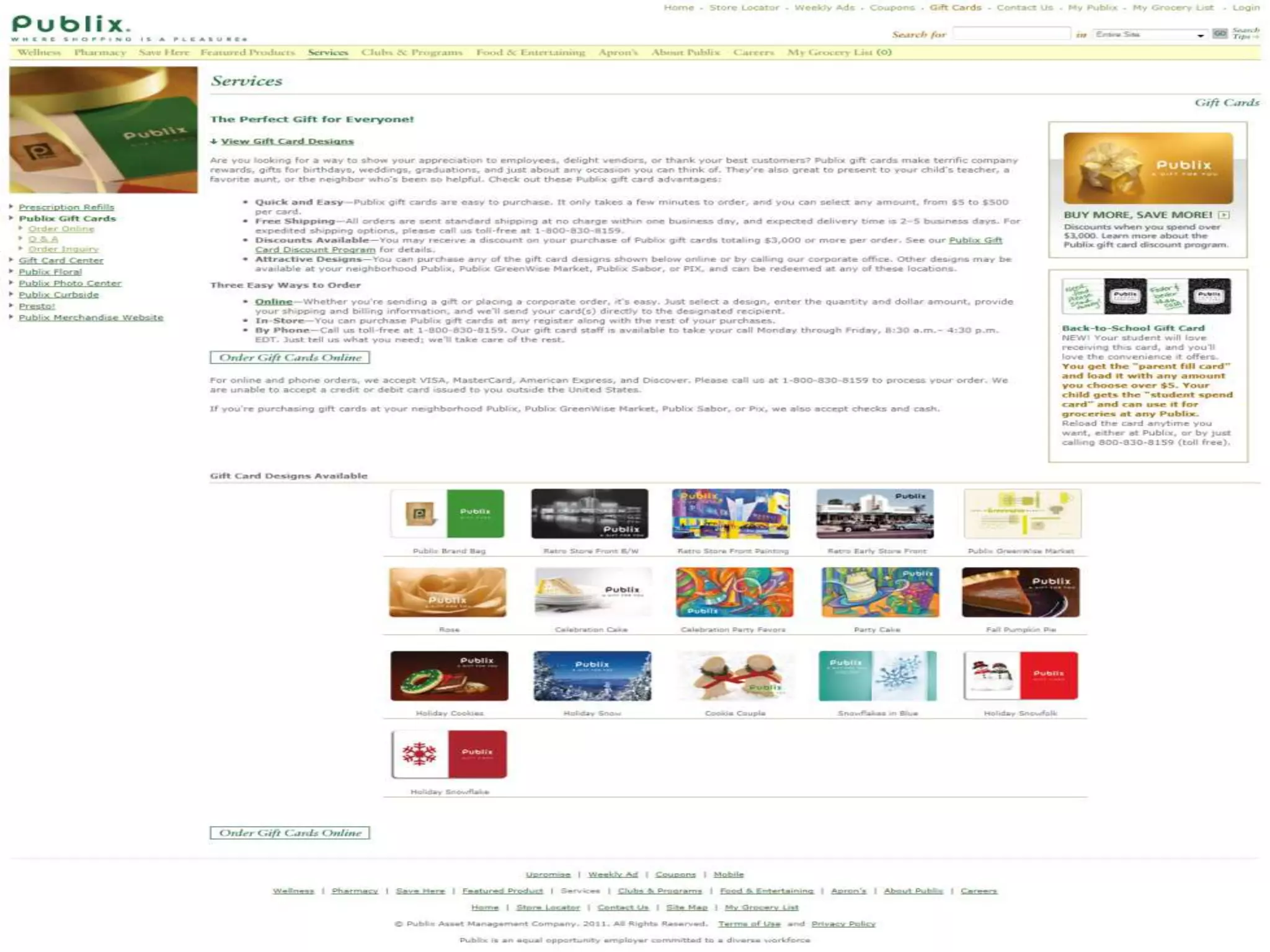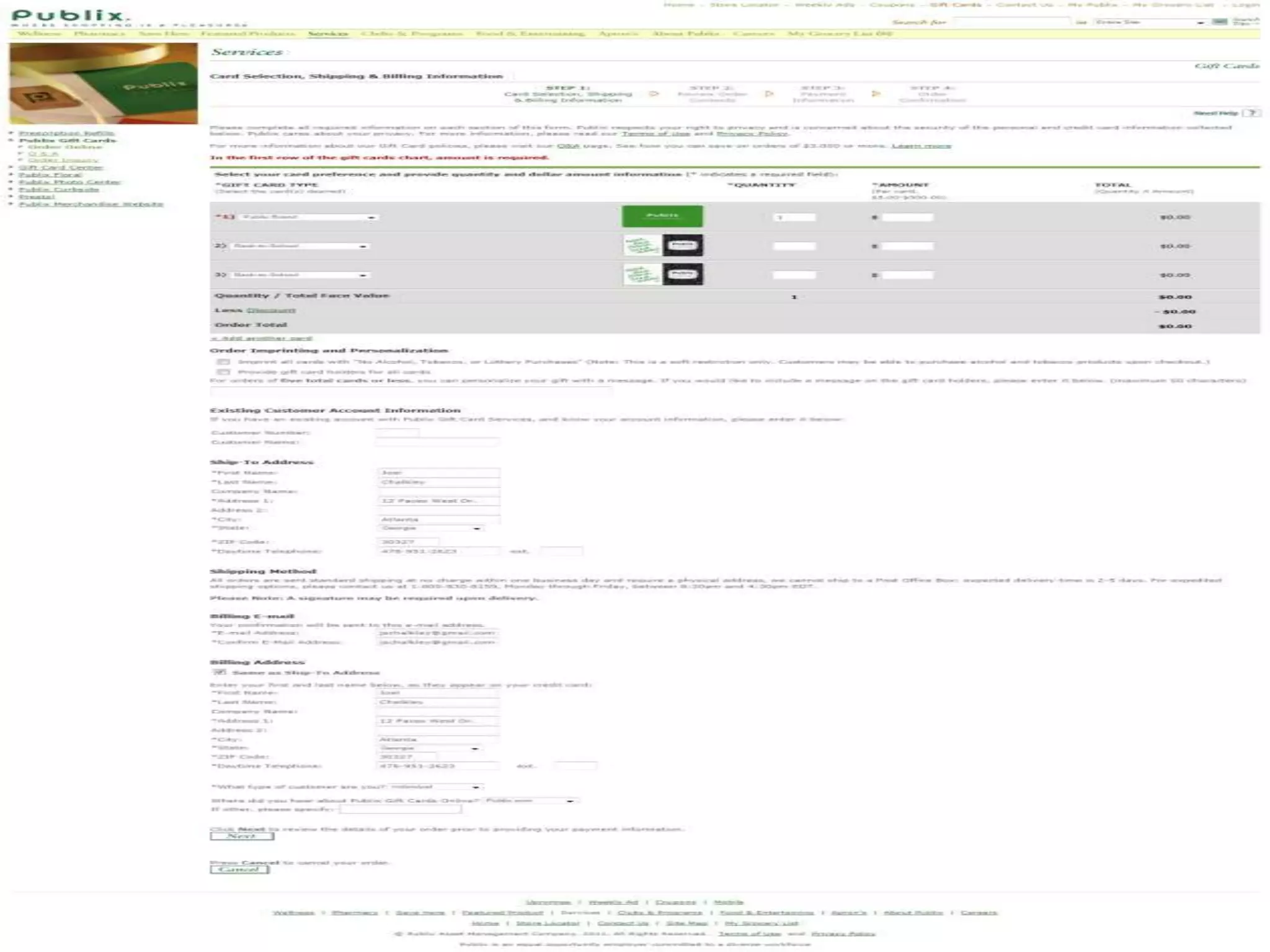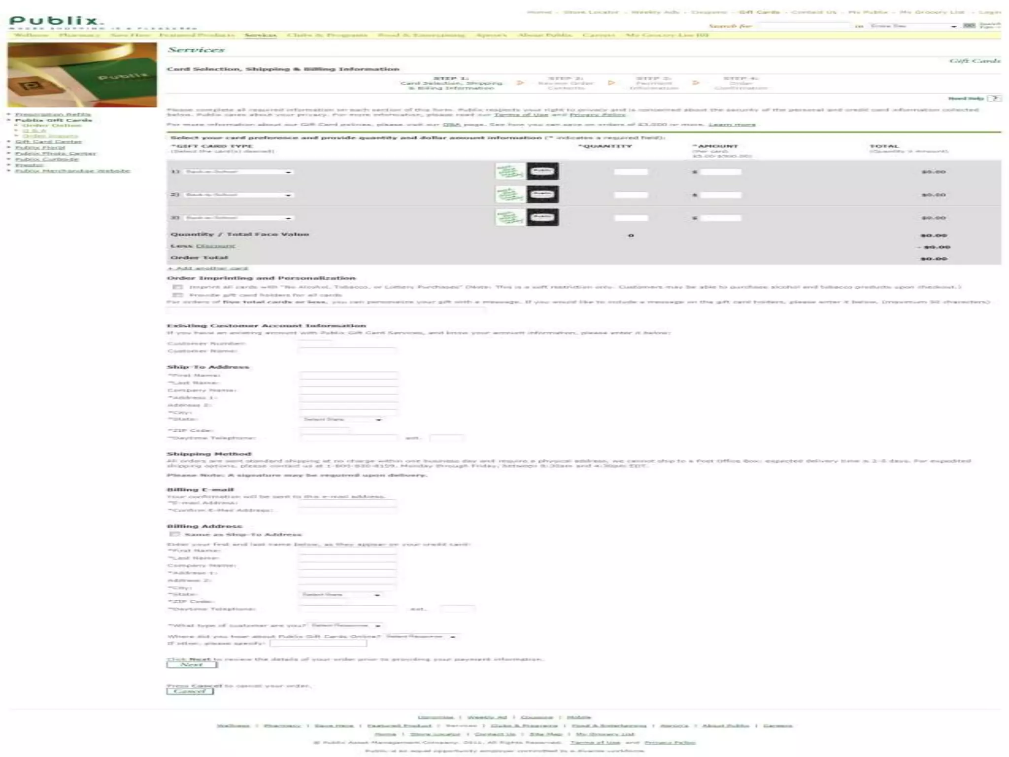 Buying gift cards in-store at Publix is easier than online. In the store, gift cards are prominently displayed near the entrance and customers can purchase them quickly at checkout. However, online customers must navigate the website to find where gift cards are listed, then provide mailing and billing addresses as well as agree to Publix's gift card terms. While finding gift cards in-store is simple, they are slightly harder to locate online initially until the correct section of the site is found. Overall, most customers should be able to purchase gift cards without issues either in-store or online.