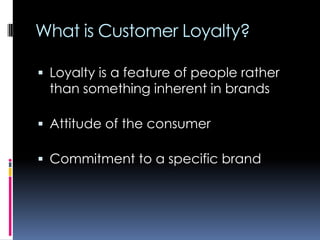 Customer loyalty programs aim to increase sales revenues and products purchased by building closer bonds between brands and customers. There are three popular models of customer loyalty: monogamy based on attitudinal loyalty, polygamy based on past purchase behavior, and promiscuity based on individual characteristics and circumstances. The implications of these models differ, with attitudinal loyalty programs focusing on enhancing positive beliefs and emotional commitment, behavior-based programs matching competitors, and contingency-based programs responding to situational factors. Loyalty programs are aimed at both increasing individual single-brand loyalty and growing brand size in the market through combination with other marketing efforts.