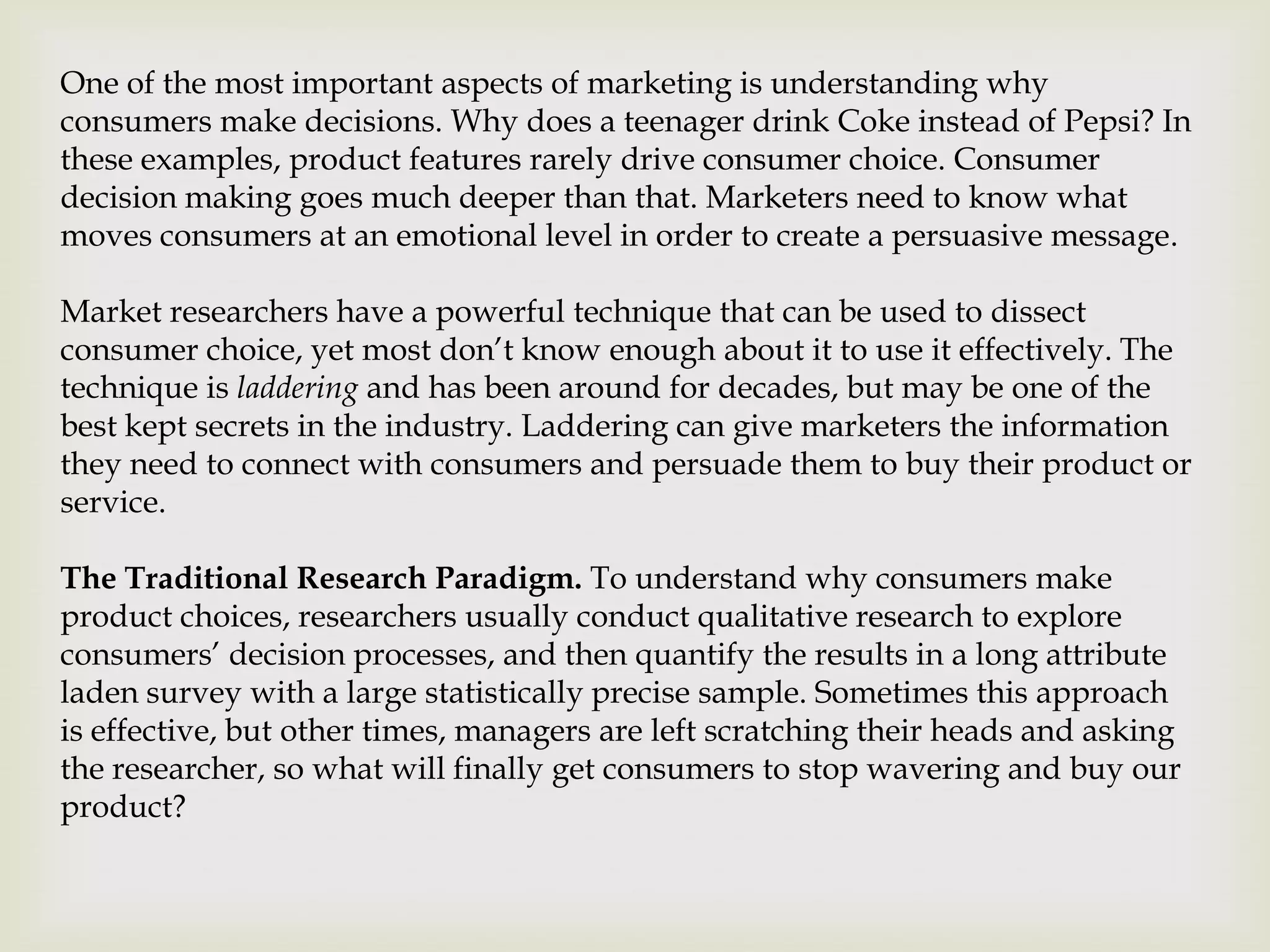 Marketers need to understand consumer decision making at a deeper emotional level to create persuasive messages. Laddering is a technique that can uncover underlying emotions, consequences, and personal values that drive consumer choice. It involves qualitative research to explore decision processes followed by a survey to quantify the results. While commonly used, laddering remains one of the best kept secrets in the industry for giving marketers insights to connect with consumers and influence their choices.