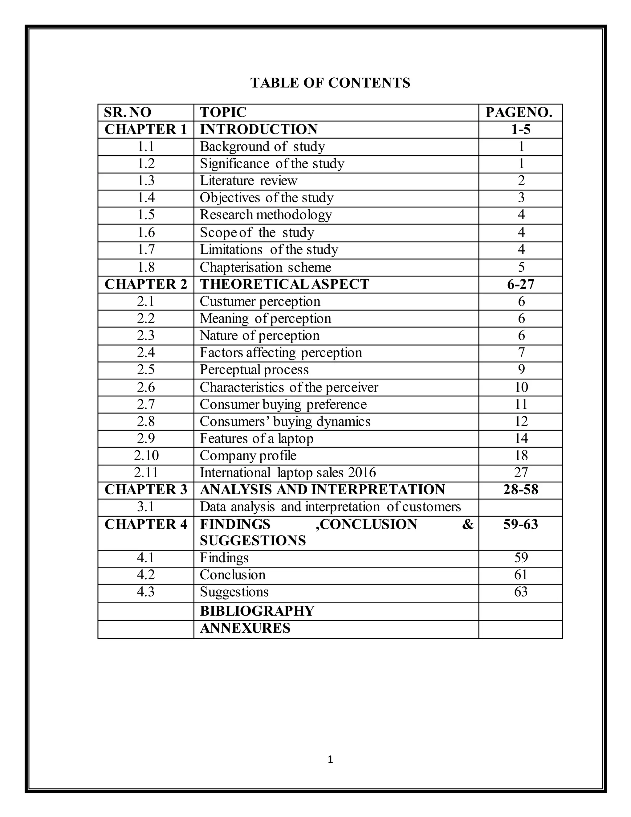 The document provides details about the table of contents and chapters of a research paper on customer perception of laptop brands. It includes an introduction describing the background and objectives of the study. It also discusses the theoretical aspects of customer perception, including the meaning and nature of perception and factors that influence it. Finally, it outlines the research methodology used in the study.