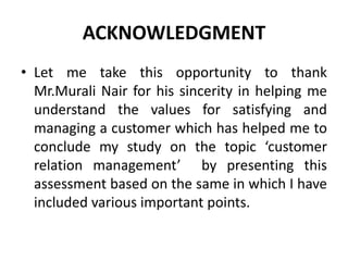 The document presents an assessment of customer relationship management (CRM) by Joe Simon, highlighting key concepts such as customer service, customer needs, satisfaction, and retention. It includes findings from surveys conducted on external and internal customers and their interactions with various organizations, illustrating the importance of effective customer handling skills. The assessment emphasizes that customer satisfaction, delight, and retention are crucial for organizational success and delves into managing customer challenges, including handling angry customers.