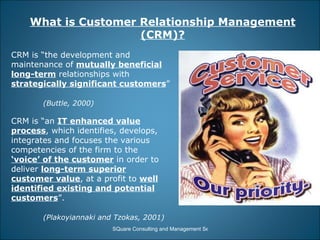 The document discusses customer relationship management (CRM) and provides several key points about CRM:
