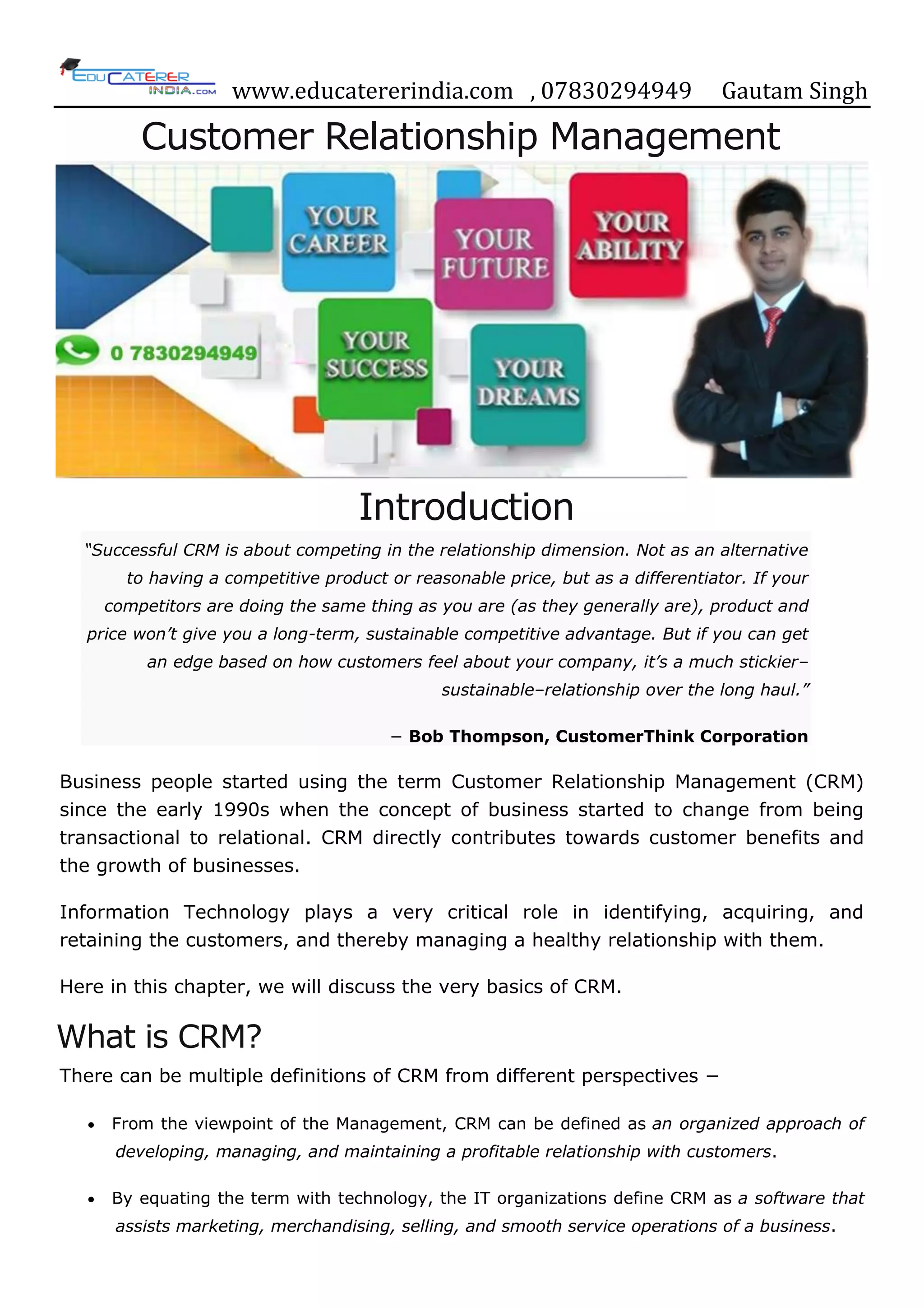 The document provides an overview of Customer Relationship Management (CRM), highlighting its importance as a strategic approach to building and maintaining customer relationships for business growth and profitability. It outlines different types of CRM, key components such as analytics and customer service, and essential objectives like improving customer satisfaction and expanding the customer base. The document also discusses the history of CRM, different relationship management theories, and factors to consider when selecting CRM software.