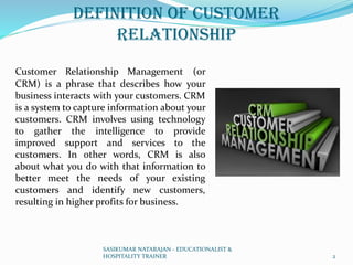 Customer Relationship Management (CRM) is a system that enables businesses to interact effectively with customers, capturing data to enhance services and identify new opportunities. It encompasses three types: operational, analytical, and collaborative CRM, focusing on improving customer engagement and internal efficiency through technology, processes, and people. Key elements for effective CRM include honest communication, respect for customers, and a commitment to continuous improvement and feedback management.