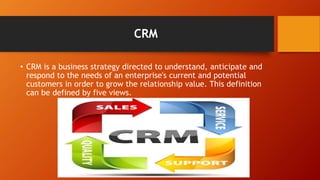 CRM involves understanding customer needs and developing strong relationships to retain customers and gain a competitive advantage. It includes collecting customer data, analyzing that data to understand customer behaviors, and using those insights to improve customer service and target marketing efforts. There are different types of CRM approaches like analytical, collaborative, operational, geographic, and sales intelligence CRM. Implementing a successful CRM strategy requires assessing current business practices, choosing an appropriate CRM model, ensuring proper IT infrastructure, and selecting partners and vendors. The goal of CRM is reduced costs, increased customer satisfaction and retention, and long-term profitability.