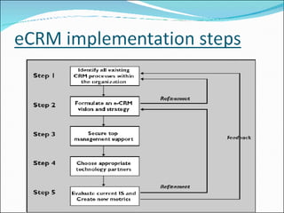 Customer relationship management (CRM) involves capturing, storing, and analyzing customer information to better manage relationships and meet customer needs. Electronic CRM (ECRM) uses internet, email, wireless technologies to contact customers, allowing for personalized experiences and more efficient marketing. While ECRM provides benefits like increased profits and loyalty, pitfalls include high costs and complexity. For ECRM projects to succeed, companies must develop customer-focused strategies, reengineer processes, provide training and security, and implement within 90 days.