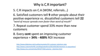 Customer retention is important for businesses for several key reasons: (1) the cost of retaining an existing customer is much lower than acquiring a new customer, (2) increasing customer retention rates by 5% can increase profits by 25-95%, and (3) satisfied existing customers are more likely to purchase again and refer others than new customers.