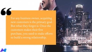 The document outlines essential customer retention strategies for e-commerce businesses, emphasizing that retaining existing customers is often more cost-effective than acquiring new ones. Key techniques include offering exclusive surprises, setting realistic customer expectations, using automation for re-engagement, and fostering community among customers. It encourages businesses to actively address complaints and leverage customer feedback to enhance loyalty and improve retention strategies.