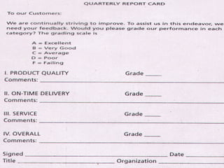 The document discusses various methods for measuring customer satisfaction. It states that customer satisfaction is multifaceted and should be measured individually to get an accurate picture. It identifies different types of customers, both internal and external. Several common methods for collecting customer feedback are described, such as comment cards, surveys, focus groups, and complaint collection. Key factors that influence customer purchasing decisions are identified as performance, features, service, warranty, price, and reputation. The document emphasizes that customer complaints should be viewed positively as an opportunity for improvement rather than a negative.