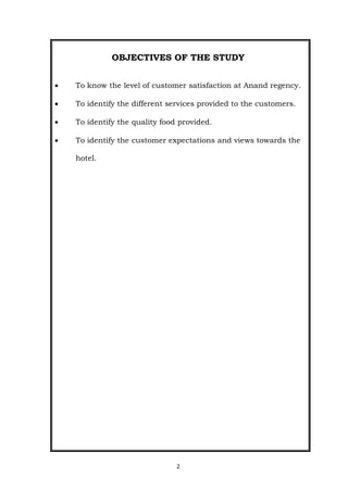 This document provides an overview of a study conducted on customer satisfaction at the Anand Regency hotel. It includes the objectives of the study, which are to understand customer satisfaction levels, services provided, food quality, and customer expectations. It outlines the need for the study to provide management insights into satisfaction. The methodology section describes the use of primary and secondary data collection. Limitations include a short time frame, limited customer surveys, and the study being restricted to one location. It also provides background on the hospitality industry and the history and profile of the Anand Regency hotel.