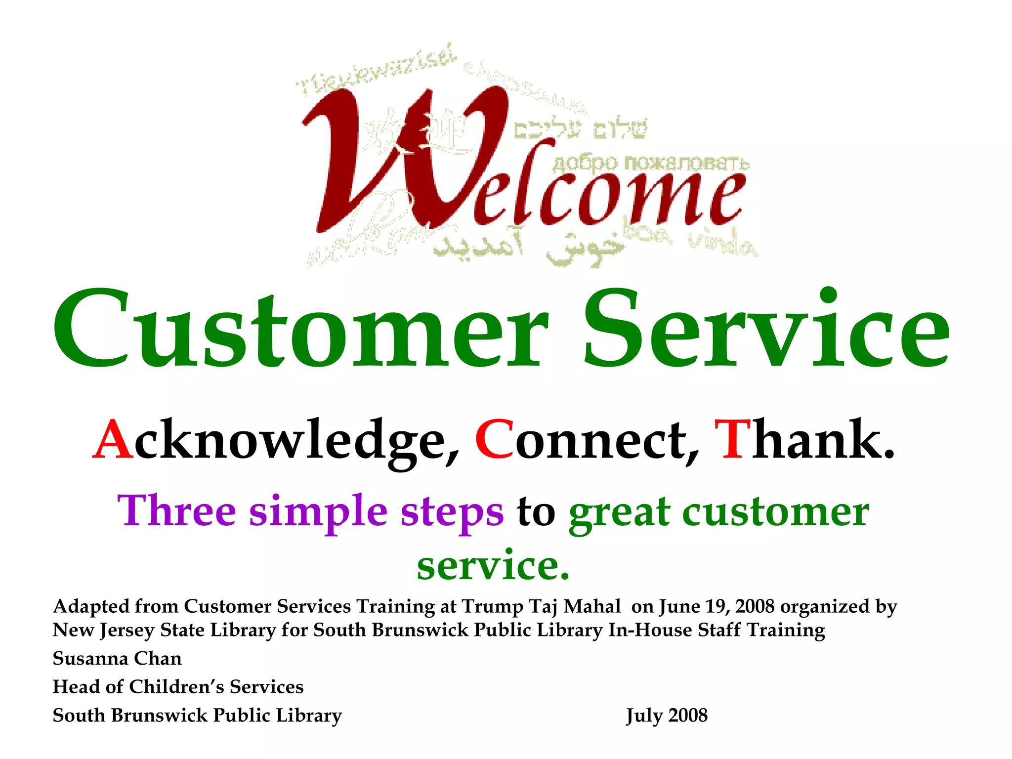 The document outlines essential customer service practices focused on acknowledging, connecting, and thanking customers. It highlights statistics on customer dissatisfaction and the importance of treating customers well, as well as standards for effective service and handling difficult situations. Additional reflections emphasize leadership, teamwork, and the positive outcomes of good customer service.