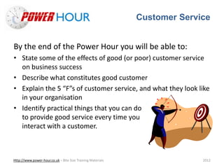 The document outlines key points from a training session on customer service. It discusses the importance of customers, what customers want from service, the five F's of customer service (first impressions, friendly welcome, find out, fulfill needs, fond farewell), and asks participants to identify actions they will take to improve customer service. The goal is to help participants understand good customer service and how to apply it in their own work.