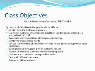 This document outlines the objectives and content of a customer service training class. The key points are: