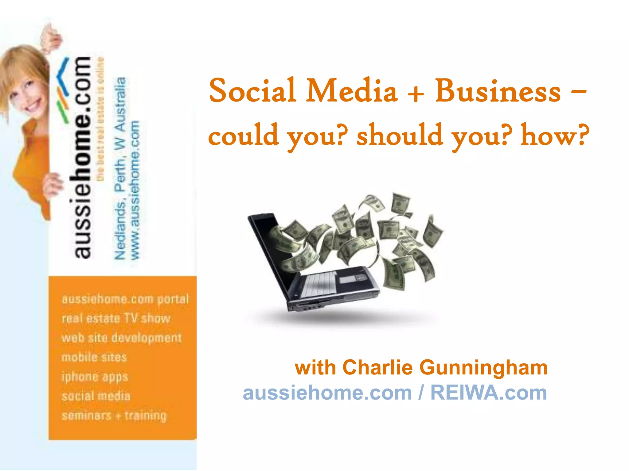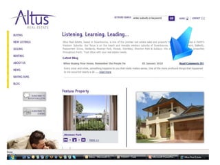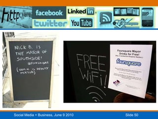 The document discusses the rise of social media and how real estate businesses can benefit from using social media platforms like Facebook, Twitter, YouTube, and LinkedIn. It notes that while 75% of small businesses don't use social media and 86% don't do email marketing, social media spending is increasing. The document provides tips on setting up business pages on Facebook and Twitter, using blogs to improve SEO, uploading videos to YouTube, and using mobile apps and sites to engage customers. It argues that social media is a cheap, powerful way for real estate businesses to connect with potential customers and get referrals.