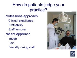 The document discusses the importance of customer service in dental practices, emphasizing that patient satisfaction significantly impacts profitability and loyalty. It outlines factors affecting customer service, including staff competence, empathy, confidentiality, and effective communication. Additionally, it suggests training programs for staff to improve service standards and highlights the role of patient loyalty and referral metrics, such as the net promoter score.