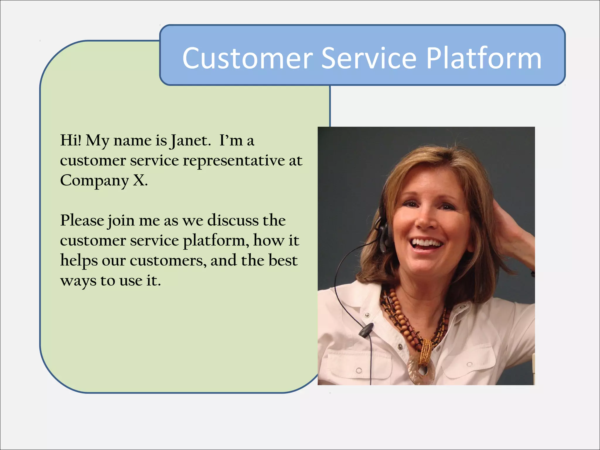 The document provides guidance on using a customer service platform, including establishing rapport with customers by introducing yourself, clarifying the purpose of the call, and addressing concerns. It also recommends progressing the relationship through discovery-based questions to understand customer needs, having a future-oriented attitude, and setting follow-ups if needed. The platform aims to help customer service representatives build trust and help customers achieve their goals.