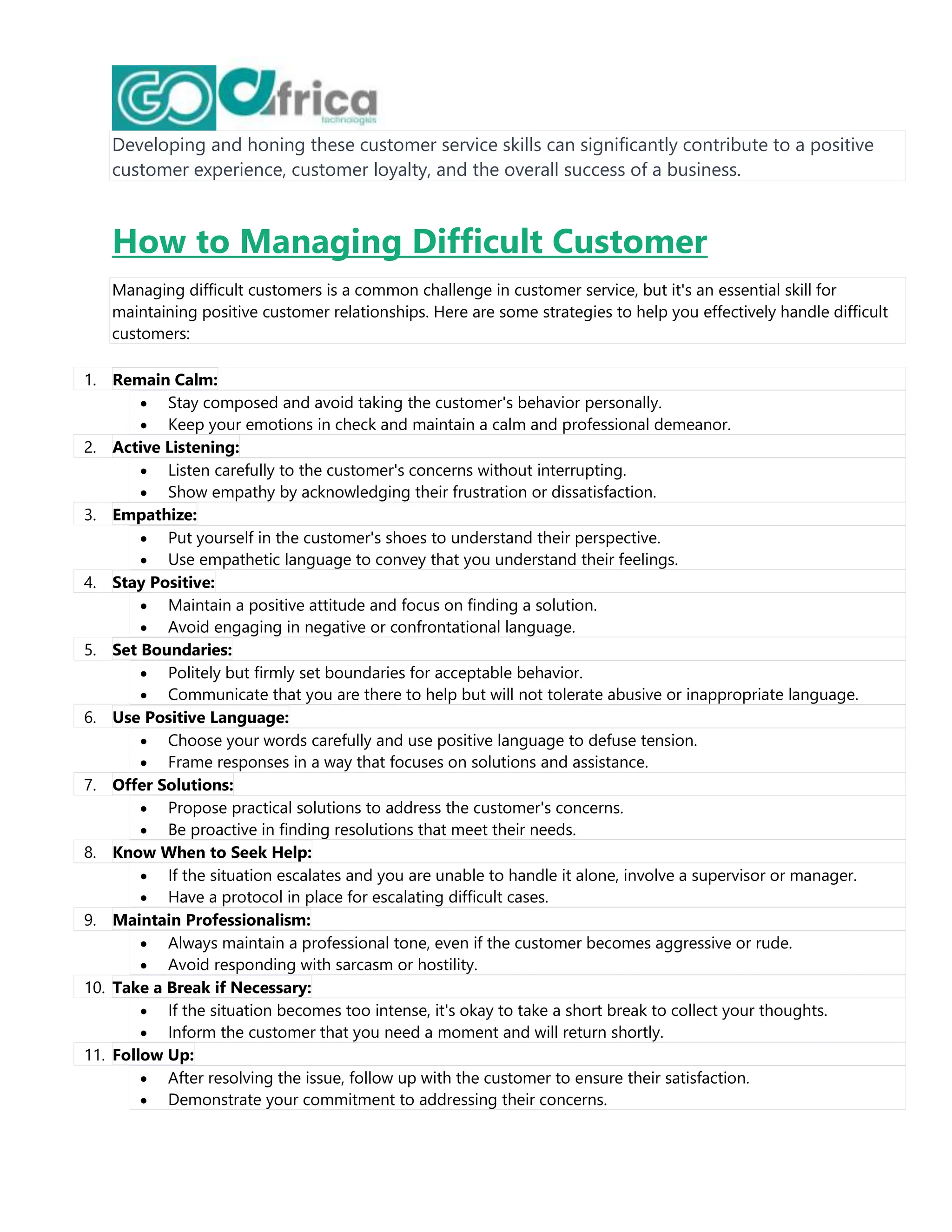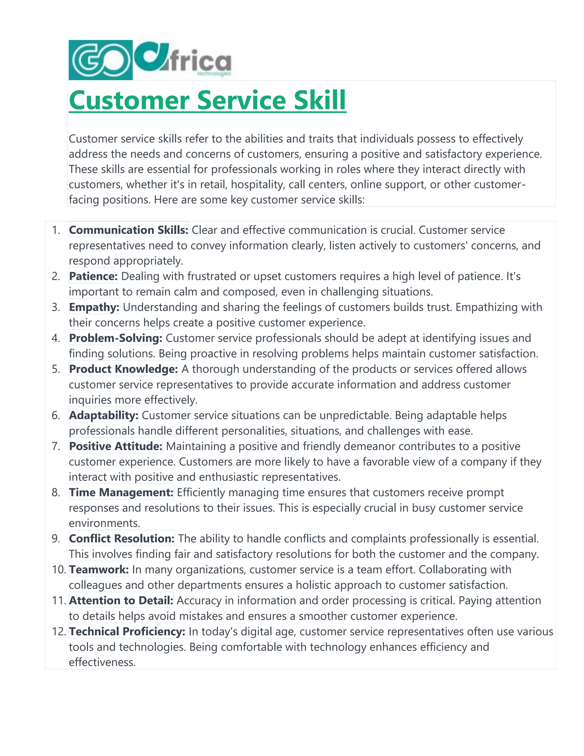 Customer service skills refer to abilities that help individuals address customer needs and ensure a positive experience. Key skills include clear communication, patience, empathy, problem-solving, product knowledge, adaptability, a positive attitude, time management, conflict resolution, teamwork, attention to detail, and technical proficiency. Developing these skills contributes to customer satisfaction, loyalty, and business success.