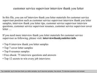 The document provides an overview of materials and tips for writing thank you letters after interviews for a customer service supervisor position, including samples, strategies for sending letters quickly, and suggestions for individual versus group letters. It emphasizes the importance of making a good impression and engaging with all contacts involved in the job search. Additionally, it includes advice on content for the thank you letters and the significance of personalization.