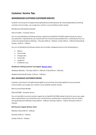 The document provides customer service contact information for Woodhouse Clothing, Bell Insurance, Tesco Mobile, and Royal Mail, including phone numbers and operating hours. Each company’s support can be reached for various issues such as order changes, returns, or complaints. The document emphasizes the importance of contacting these services during their respective business hours for quicker resolutions.