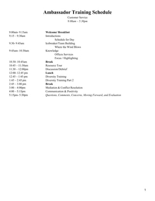 This document outlines an 8 hour training session for student ambassadors on customer service. It includes an agenda with sessions on icebreakers, campus knowledge, diversity training, conflict resolution, communication, and evaluation. Details are provided for several sessions, including an icebreaker activity called "Where the Wind Blows", an overview of key campus offices for ambassadors to know, tips for providing tours and addressing financial concerns, and objectives and methods for diversity training. The goal is for ambassadors to gain knowledge and skills to effectively serve a diverse group of prospective students and their families.