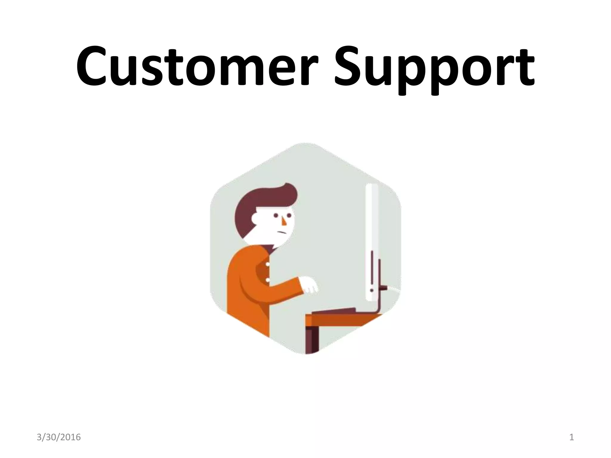 The document outlines key aspects of customer support, emphasizing its importance and the impact of good versus bad support on customer loyalty and business reputation. Effective customer support involves communication and understanding customer needs, with various support methods including email, phone, and live chat, each having pros and cons. Finally, it discusses strategies to positively influence customer emotions and the importance of leaving a lasting impression on customers.