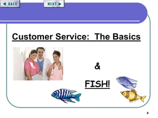 The document provides an overview of customer service training at KCC, including its philosophy, standards, feedback programs, service recovery approach, and recognition programs. The training's objectives are to introduce KCC's customer service philosophy and standards, understand feedback programs, review commitment to service excellence, and strengthen service recovery skills. Customer satisfaction is a priority, as it is an indicator of quality care and drives customer retention.