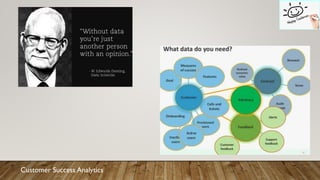 This document discusses customer success analytics and key metrics for customer managers. It recommends tracking 1) usage metrics and feedback to understand customer engagement, 2) customer engagement through check-ins, reviews and support, 3) adoption of smart use cases through training and predictive analytics, and 4) key performance indicators like churn, satisfaction, utilization, renewals and expansion. Maintaining a customer success dashboard can help track metrics like health scores and provide insights.